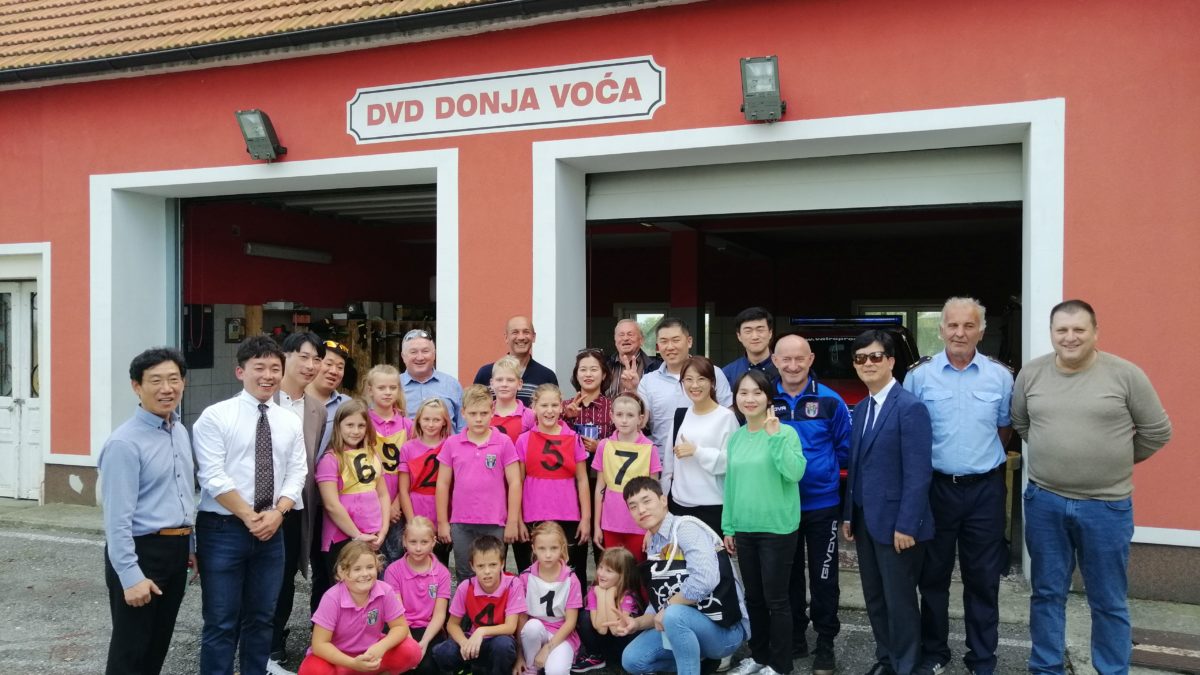 U petak,27.rujna DVD Donja Voća posjetila je delegacija Nacionalne vatrogasne agencije iz Južne Koreje koja boravi u prijateljskoj posjeti Hrvatskoj. Delegaciju su činili zapovjednici i predstavnici jedanaest regionalnih vatrogasnih centara iz Južne Koreje. Cilj posjete je bio da se upoznaju kako radimo sa najmlađim uzrastom tj, sa djecom i mladeži. Na poligonu za mladež prezentirali smo vježbu za mladež sa preprekama i štafetnu utrku , a ispred vatrogasnog doma vježbu sa brentačama za djecu. Gosti su bili oduševljeni prikazanim i iskazali zanimanje za pojedine radnje te su ih i sami pokušali izvoditi.